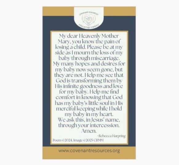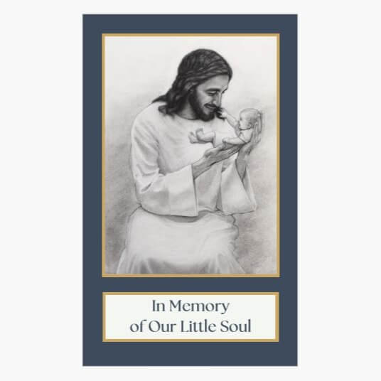 These color, professionally printed, UV coated cards have a picture of Jesus holding a baby on the front and a Catholic prayer for miscarriage on the back. The Harprings commissioned Michael McCarthy of Indianapolis, Indiana to do the drawing based on Rebecca’s concept of how she liked to picture a miscarried baby in Jesus’ arms. The prayer was written by the Harprings.