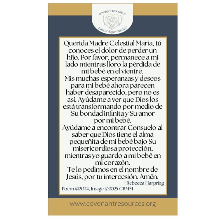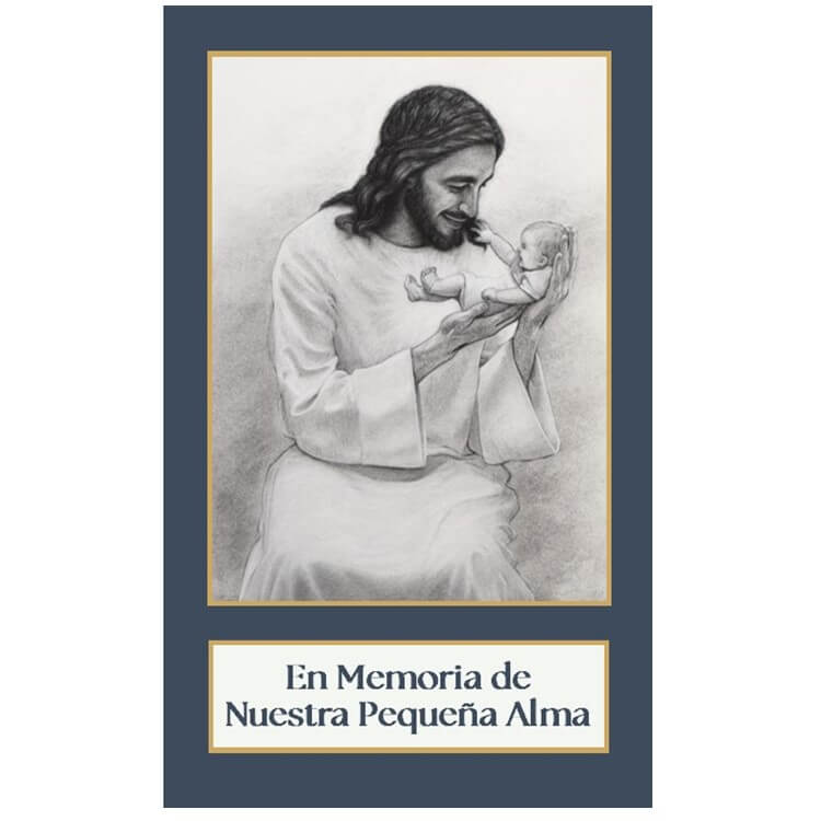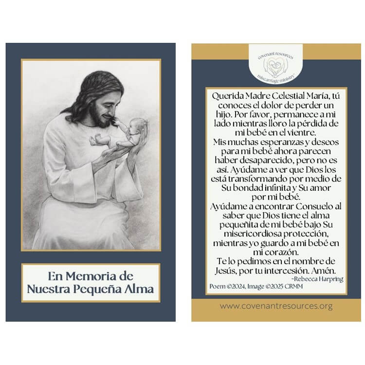 These color, professionally printed, UV coated cards have a picture of Jesus holding a baby on the front and a Catholic prayer for miscarriage on the back. The Harprings commissioned Michael McCarthy of Indianapolis, Indiana to do the drawing based on Rebecca’s concept of how she liked to picture a miscarried baby in Jesus’ arms. The prayer was written by the Harprings.